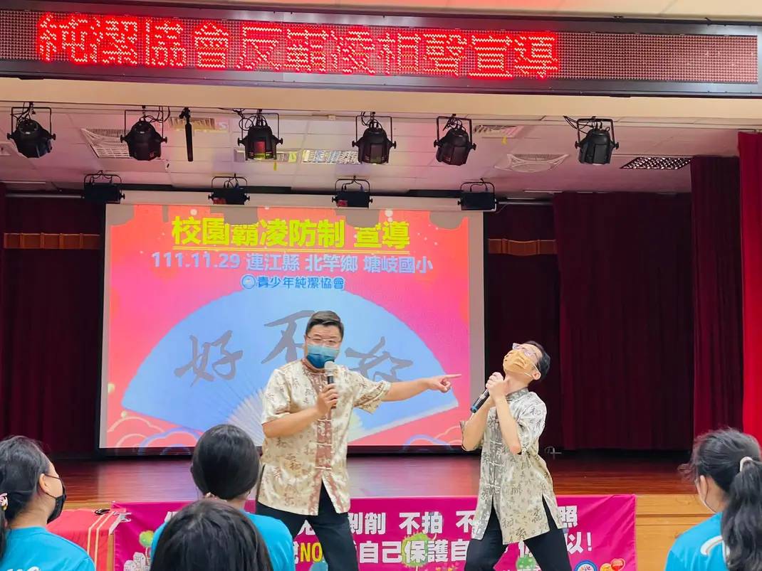為減少校園霸凌事件的發生,教育部於本學期開學日結合「友善校園週」舉辦「反霸凌專線電話1953」啟用活動,提供24小時諮詢服務及通報管道,共同「拒絕霸凌」,一起勇敢大聲向校園霸凌說「不」。繼去年2021年的馬祖南竿師生回饋「宣導讓我獲益匪淺,豐富了我的生活」後,純潔協會再推出全新主題〜校園霸凌防治,11月飛往南北竿學校共6場宣導服務。