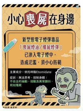 目前被列為二級毒品的依托咪酯,也就是俗稱的「喪屍煙彈」,這類新興毒品,吸食者往往藉由容易取得的電子煙等載具,在學生族群間普及,流行的速度超乎想像。