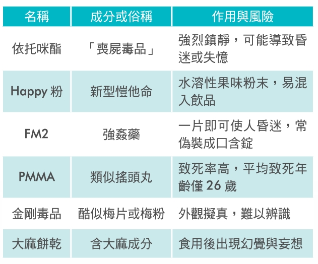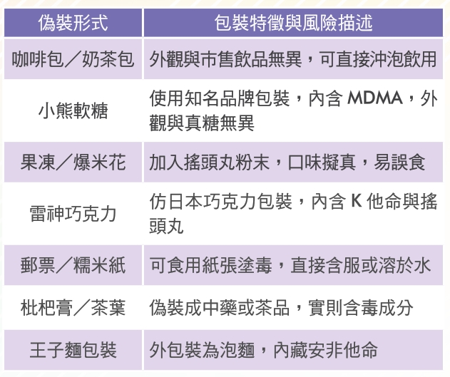 近年來,新興毒品為了規避查緝並降低青少年的警覺心,會將毒品偽裝成日常生活中常見的食品或用品,這些「食品化」的包裝讓毒品更具誘惑性與危險性。以下為常見的種類與其偽裝方式: